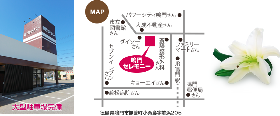 | 所在地 | 家族会館 〒771-1240 徳島県板野郡藍住町乙瀬中田88-1 直葬会館 〒771-1240 徳島県板野郡藍住町乙瀬中田88-2 |